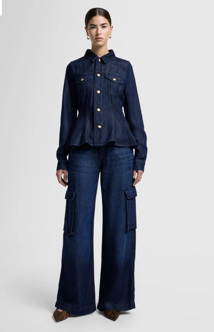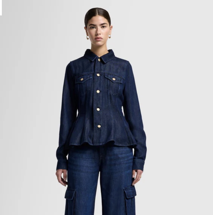 Cut in the rich Stormy wash, this jacket reimagines everyday denim with a feminine twist. Featuring a collared silhouette, fitted bodice, and dramatic peplum hem, it flatters the figure while offering surprising comfort. The key? Denim Lustre—a rigid yet lightweight fabric that delivers a silky-soft, cool-to-the-touch finish.