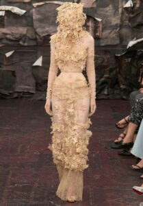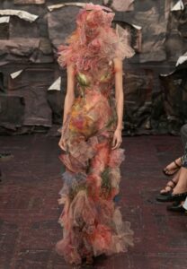Textures were paramount — crushed velvets, worn brocades, hand-stitched lace, and deconstructed knits layered with unexpected materials such as translucent plastics, gilded threads, and shattered mirrors embedded into bodices. Accessories included sculptural headpieces, lace masks, and elaborate gloves, turning models into living installations.