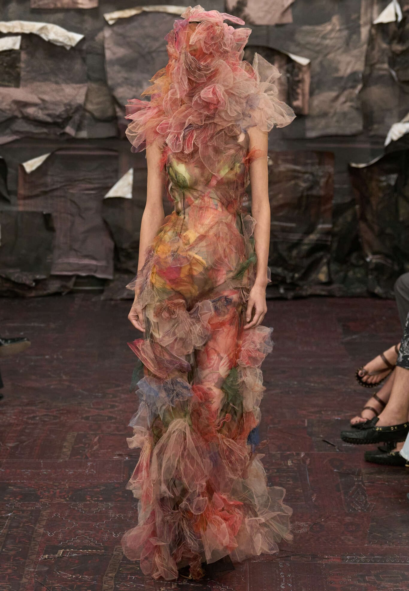 Creative director Glenn Martens orchestrated a procession of silhouettes that balanced armor-like structure with ghostly fluidity. Floor-length coats in cracked leather and tapestry jacquards moved alongside billowing gowns in chiffon and tulle, their edges frayed as though pulled from the attic of a grand but forgotten chateau. Each look seemed to carry the weight of a narrative, the clothes whispering stories of past lives.