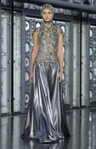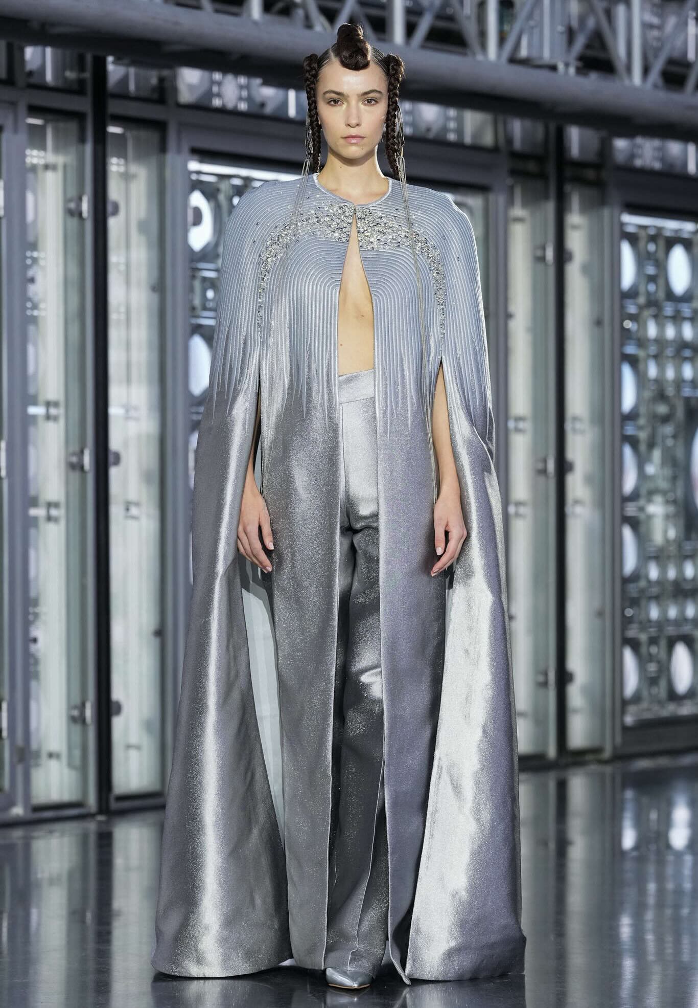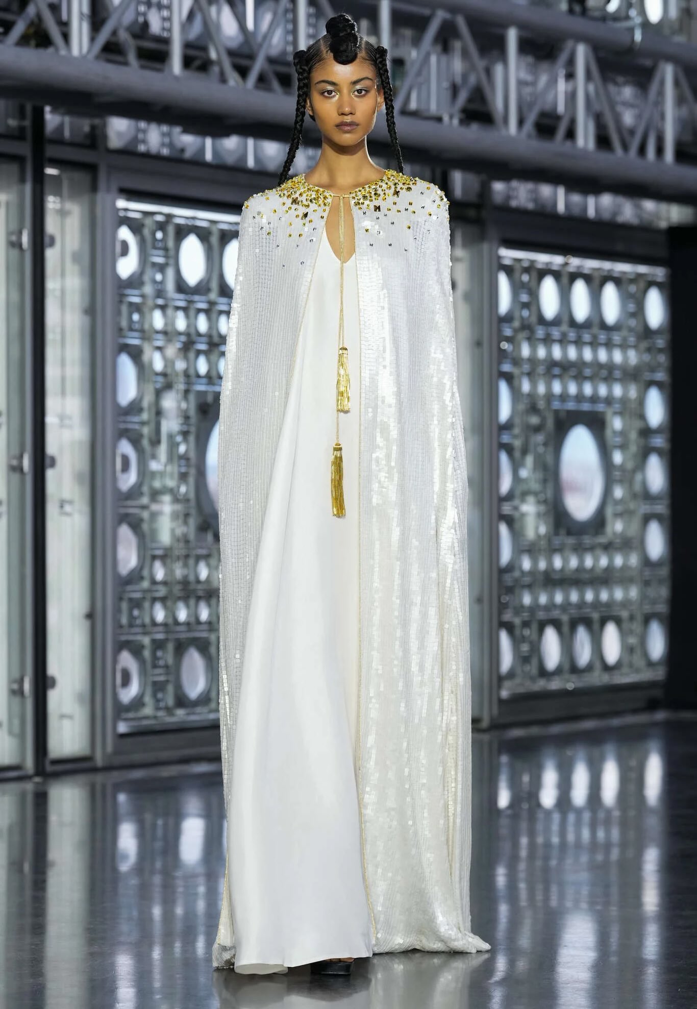 Chraibi’s designs featured flowing silhouettes and shimmering textures, evoking the serenity of the heavens. The use of delicate fringe and metallic accents added movement and light, enhancing the collection’s otherworldly feel. kendam.com