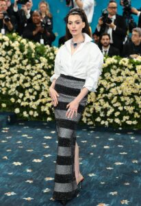 Nicki Minaj embraced the theme in a chic Thom Browne pinstripe suit-dress. The structured ensemble, featuring corset detailing and a dramatic train, showcased her commitment to fashion-forward interpretations .People.com+1Yahoo Lifestyle+1