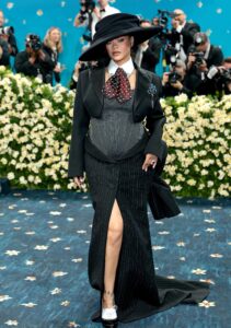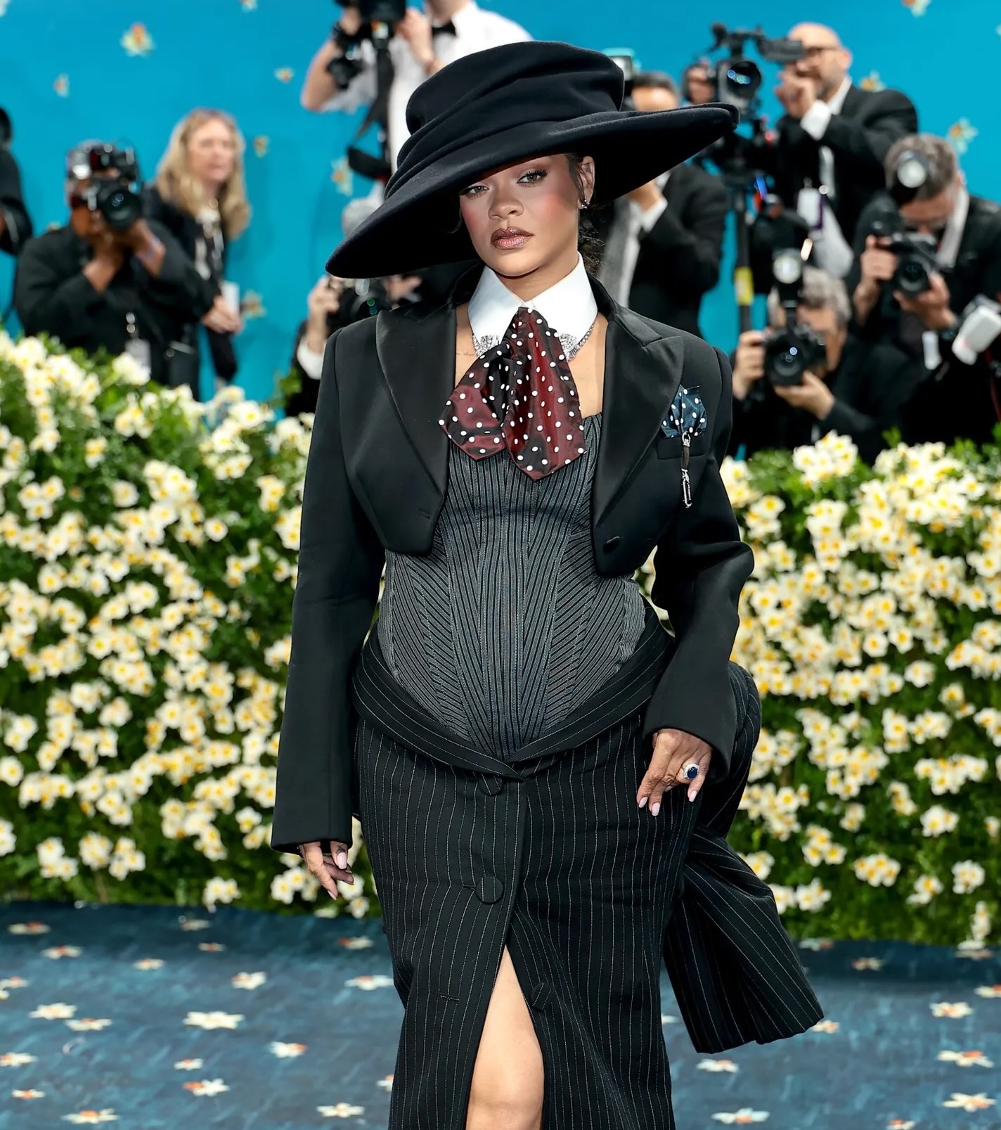 Rihanna made a dramatic entrance, revealing her third pregnancy in a Marc Jacobs ensemble. Her outfit included a black cropped woolen jacket, a pinstripe tailored skirt with a bustle, and a polka dot satin cravat, complemented by a custom hat from Stephen Jones. The look exemplified her signature blend of maternity fashion and high style .Harper’s BAZAAR+14ElHuffPost+14Harper’s BAZAAR+14Vogue+1ElHuffPost+1Vogue