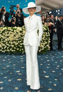 Zendaya captivated attendees in a custom white Louis Vuitton three-piece suit, designed by Pharrell Williams. The ensemble, featuring bell-bottom pants, a tailored blazer with silver snake detailing, and a wide-brimmed hat, paid tribute to Bianca Jagger’s iconic 1971 wedding suit. Styled by Law Roach, the look seamlessly blended ’70s glamour with modern sophistication .New York Post+5Marie Claire+5Latest news & breaking headlines+5New York Post+1Vogue+1