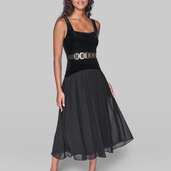 The Velvet and Chiffon Belted Midi Dress is the ultimate black dress of the day, delivering timeless sophistication with a modern holiday-ready edge. Designed...