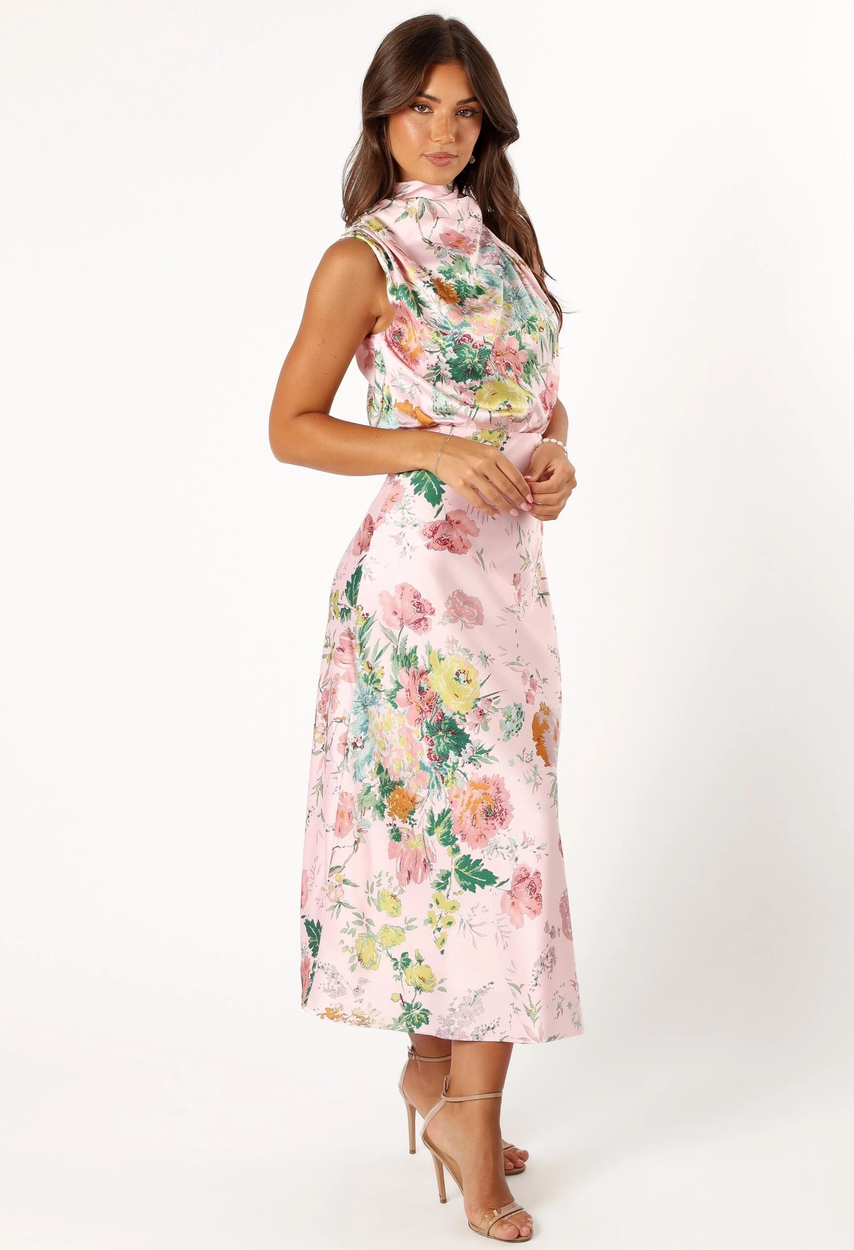 The halter neckline gives the dress a sleek and flattering finish, while the midi length adds balance, elegance, and timeless appeal. Its soft pink hue makes it especially fitting for seasonal dressing, offering a romantic and stylish update to any wardrobe.