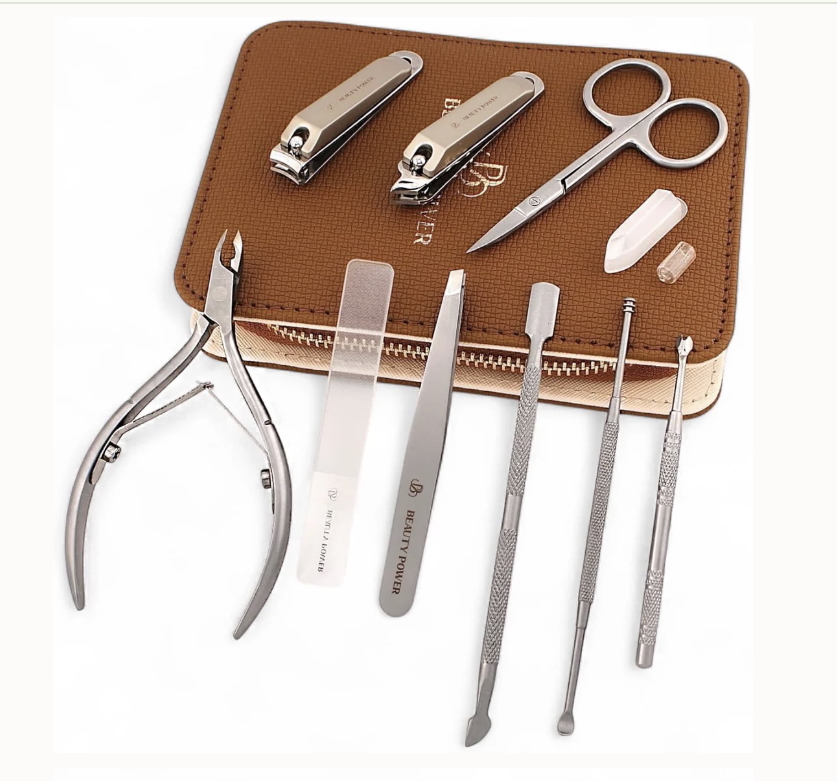 Explore the product here: https://beautypower.pro/collections/manicure-sets/products/9-in-1-professional-manicure-pedicure-set-stainless-steel-nail-clippers-nano-file-cuticle-nipper-scissors-tweezers-travel-pu-leather-case-for-men-women-gift-ready-brown